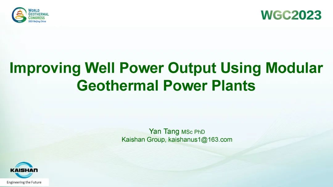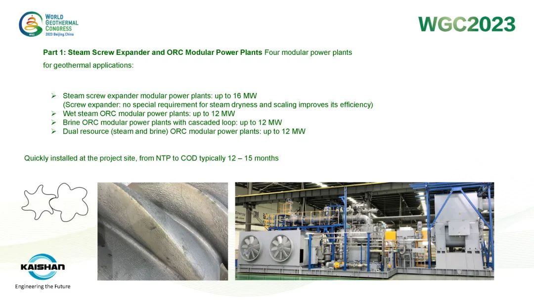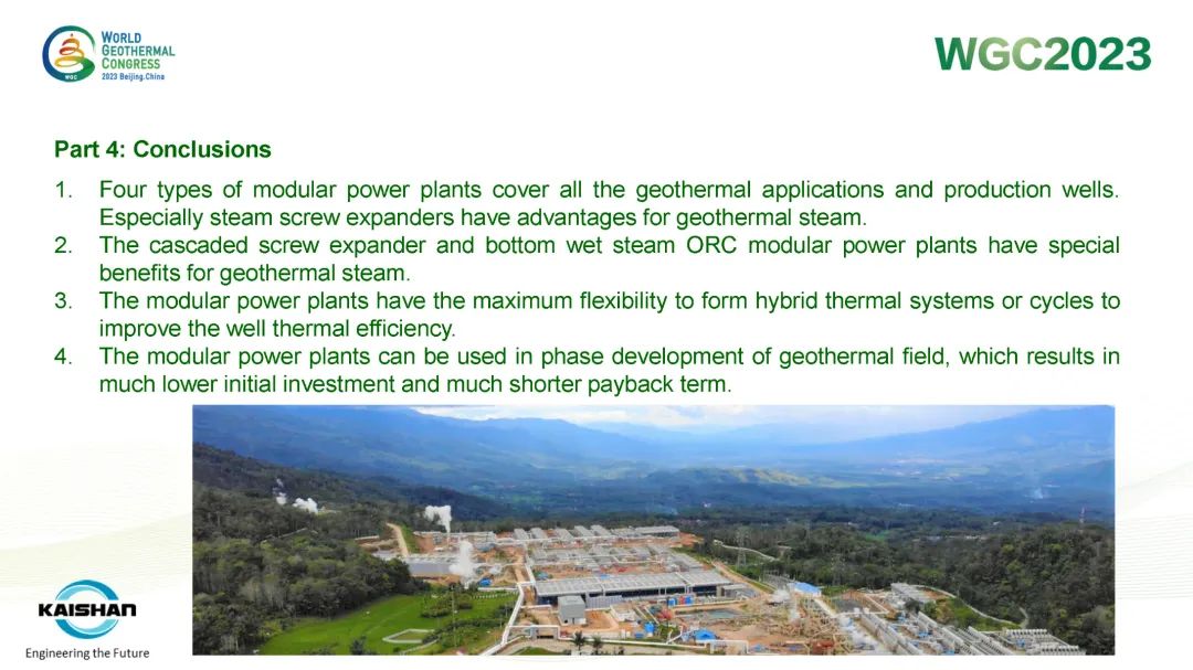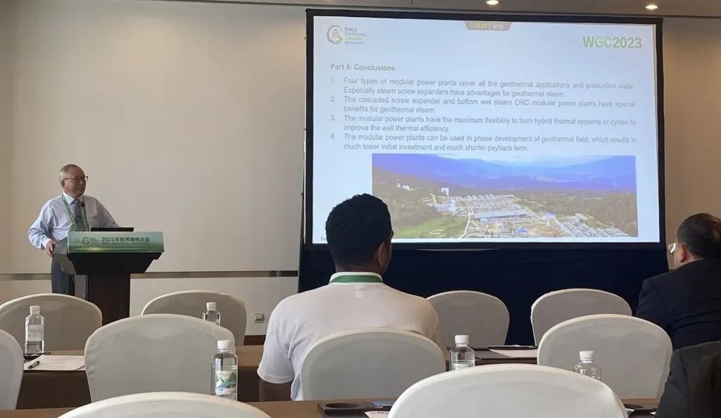 9月16日,公司總經(jīng)理、開山地?zé)峋谀K發(fā)電技術(shù)創(chuàng)始人湯炎博士參加2023年北京世界地?zé)岽髸?huì)(WGC),并受國際地?zé)釁f(xié)會(huì)(IGA)首席執(zhí)行官M(fèi)arit Brommer女士邀請(qǐng),做了題為《使用地?zé)崮K電站提高地?zé)峋a(chǎn)量》(Improving Well Power Output Using Modular Geothermal Power Plants)的專題報(bào)告。