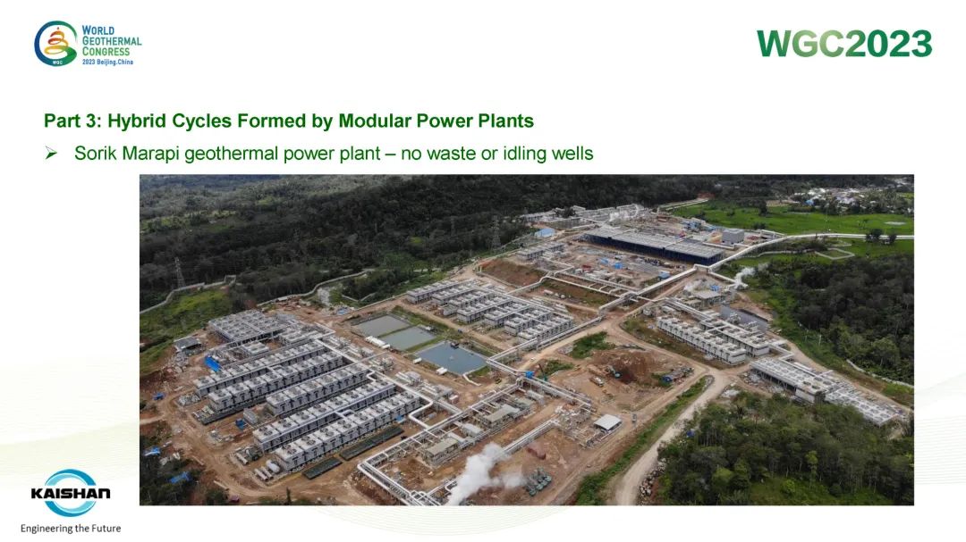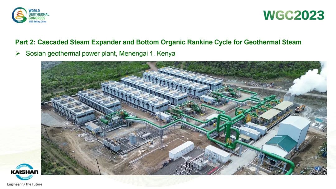 湯炎博士著重介紹了由開山EPC建設(shè)的肯尼亞Sosian-Menengai地?zé)犭娬炯伴_山自主開發(fā)、建設(shè)、運(yùn)營的Sorik Marapi地?zé)犭娬境晒Π咐osian-Menengai地?zé)犭娬静捎谩罢羝蛎洐C(jī)+濕蒸汽ORC膨脹機(jī)”模塊電站串級(jí)循環(huán),無需采用傳統(tǒng)中央電站分離不凝性氣體的蒸汽噴射器和真空泵,從而降低了電站寄生負(fù)荷、提高其發(fā)電效率。Sorik Marapi項(xiàng)目是公司各類型模塊電站的集大成者,高壓蒸汽井、低壓蒸汽井、熱水井熱源均可得到充分利用,進(jìn)而使項(xiàng)目實(shí)現(xiàn)“無閑置低壓/低溫井”。模塊電站“量體裁衣”式的解決方案通過提高井熱效率改善了地?zé)衢_發(fā)的經(jīng)濟(jì)性,也通過獨(dú)樹一幟地有效利用低壓地?zé)峋盁崴?,顯著降低了資源鉆探的單位成本。