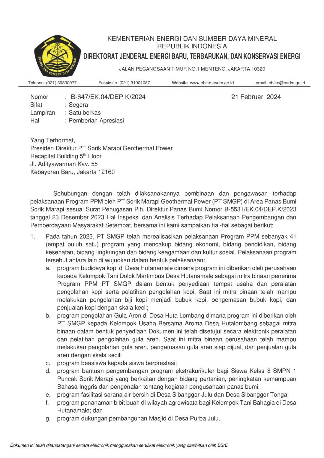 今天上午,開山集團投資在蘇門答臘Mandailing Natal縣的地熱項目公司PT SMGP收到一份來自印尼能礦部可再生和新能源總局(EBTKE)地熱處長Pak Harris簽署的“致PT SMGP的感謝信”,該信函的主旨是對SMGP公司 CDCR 團隊為 Sorik Marapi-Roburan 工作區的社區發展計劃所做的巨大努力表示感謝。SMGP實施的社區發展計劃和援助表明,除了為SMGP運營所在地的社區持續提供地熱開發所產生的電能外,公司還致力于提供其他福利。